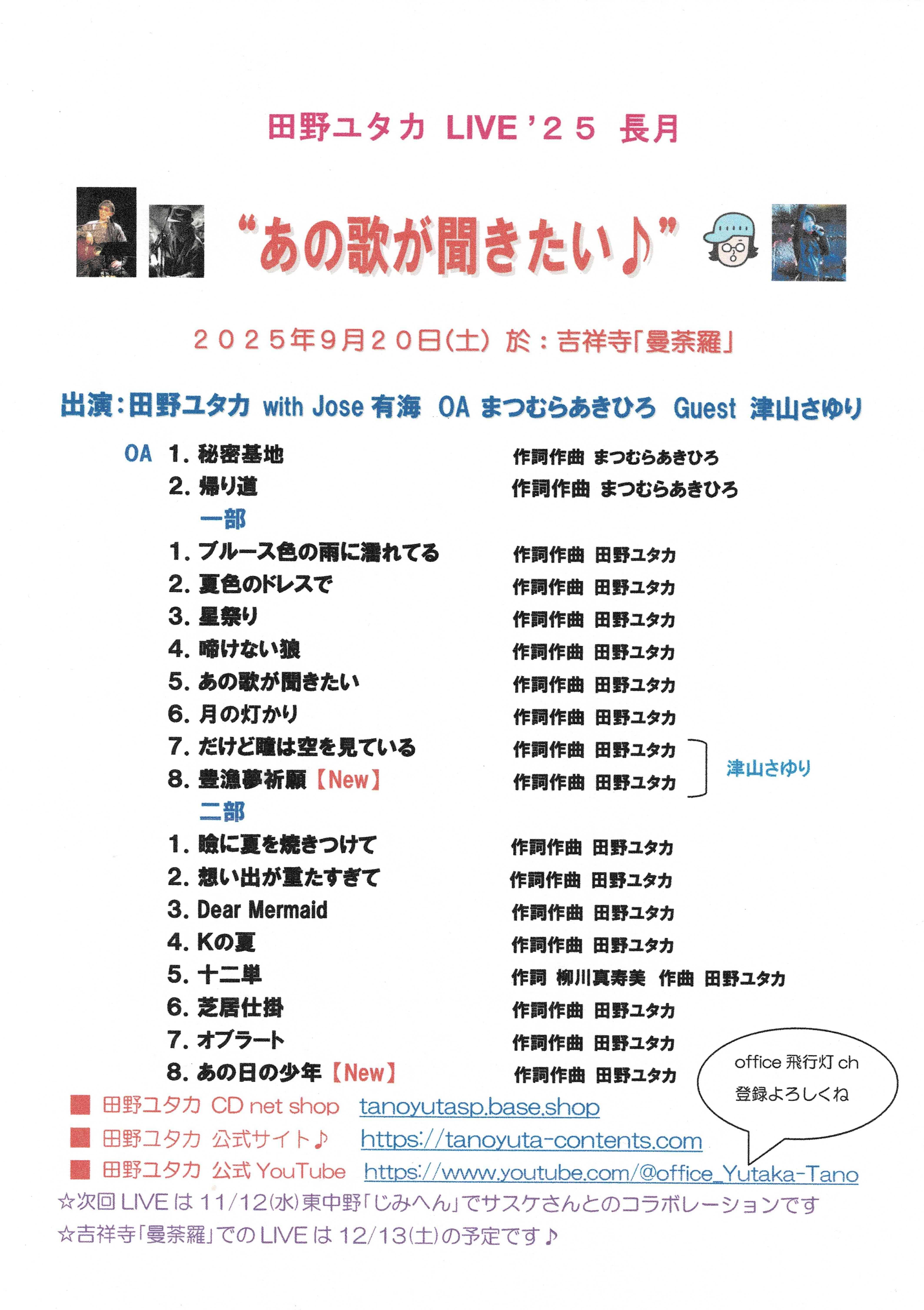 ゲストの津山さゆりさんは9/13にAlbumを発売し、田野は内3曲を提供しています。その他リリースを目指してお祭り演歌を1曲提供!