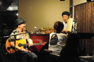 お盆休み最終の日曜、まだ明るい時間に始まる夏のLIVE敢行だ!本番前のおちゃらけオジサンズ!ん?この日は浴衣姿の方も多いぞ♪