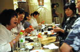 音響の加藤さん差し入れの福井のブランド西瓜【小太郎】で渇きを癒す出演者とお客様…浴衣美人もチラホラ♪夏のLIVEだねぇ♪