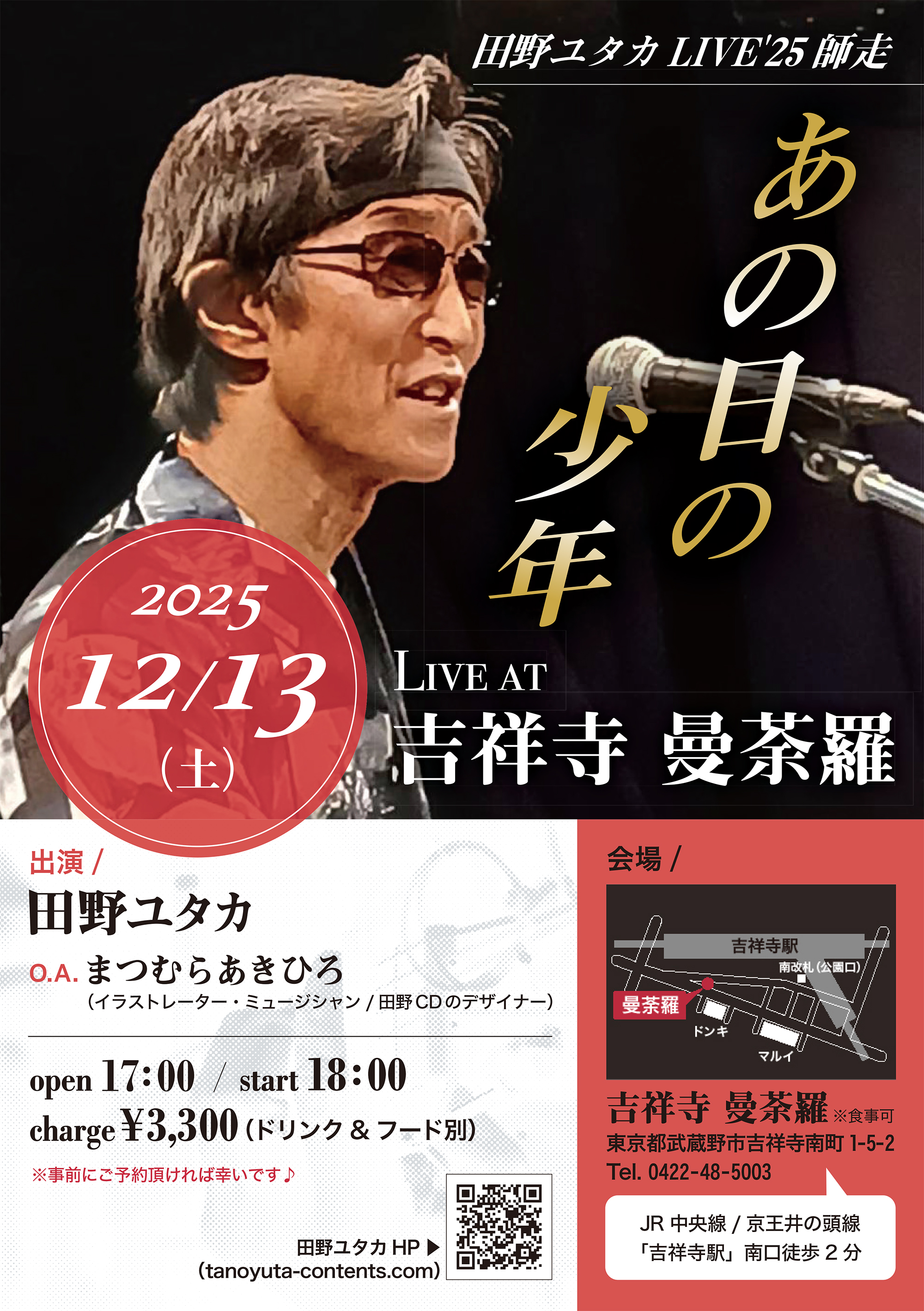 | □ 2022年3月26日 大塚「Welcomeback」 田野ユタカ LIVE 2022春“音楽を取り戻せ”♪ □ 2022年5月3日 大塚「Welcomeback」 田野ユタカ LIVE 4th レコ発LIVE“抑圧の時を越えて”♪ □ 2022年5月7日 八ヶ岳「Palm Spring」 田野ユタカLIVEツアー2022レコ発LIVE“音楽のチカラ”♪ □ 2022年9月23日 千葉中央「詩 音」 田野ユタカLIVEツアー2022 千葉 “だから海に来た”♪ □ 2023年6月10日 巣鴨「手風琴」 田野ユタカ LIVE 2023初夏 “つれづれ独り語り2023”♪ □ 2023年9月23日 阿佐ヶ谷「harness」 田野ユタカ LIVE 2023秋 “つれづれ独り語り@harness”♪ □ 2023年12月6日 東中野「Caféじみへん」 サスケ&田野ユタカ LIVE"あの~ちょっと待って東京"♪ □ 2024年1月14日 阿佐ヶ谷「harness」 田野ユタカ LIVE 2024冬 “つれづれ独り語り”♪ □ 2024年3月20日 阿佐ヶ谷「Oil City」 田野ユタカ LIVE 2024春 “綺麗事のマジシャン”♪ □ 2024年5月11日 八ヶ岳「Palm Spring」 田野ユタカ LIVEツアー’24 八ヶ岳 “約束の場所へ”♪ □ 2024年6月8日 東中野「Caféじみへん」 田野ユタカ LIVE '24 夏 “啼けない狼”♪ □ 2024年9月23日 阿佐ヶ谷「harness」 田野ユタカ LIVE 2024秋 “つれづれ独り語り”♪ □ 2024年11月16日 吉祥寺「曼荼羅」 田野ユタカ LIVE 2024 霜月 “Studio R/D”♪ □ 2025年3月20日 吉祥寺「曼荼羅」 田野ユタカ LIVE 2025 弥生 “貴方の笑顔に逢いたい”♪ □ 2025年5月3日 吉祥寺「曼荼羅」 田野ユタカ LIVE 2025 皐月 “Tokyo City Lights”♪ □ 2025年9月20日 吉祥寺「曼荼羅」 田野ユタカ LIVE 2025 長月 “あの歌が聞きたい”♪ □ 2025年11月12日 東中野「じみへん」 サスケ&田野ユタカ LIVE “黄金色の風景画”♪ |