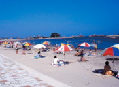 黒潮の激しい流れにさらされる中で、岬の根元に遊泳可能な穏やかな砂浜が広がります。