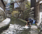 水と共存する人々の暮らしの知恵や風情を感じます。川には、太公望が鮎を狙って群がります。